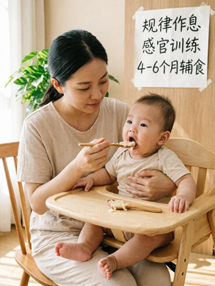 * 辅食添加的“第一课”:一般在宝宝满6个月时,就可以开始添加辅食了。第一口辅食最好是富含铁的婴儿米粉,遵循从一种到多种、从少到多、从稀到稠的原则。切记,1岁内不要在辅食中加盐和糖。